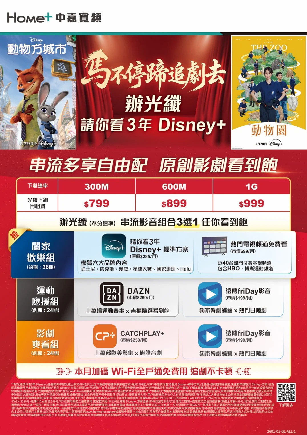 中嘉寬頻|萬象 馬不停蹄追劇去!申辦光纖上網,即享3年 Disney+ 標準方案(原價$285/月)免費看到飽,還能從三大串流影音組合中自由挑選,不論是追迪士尼經典、看運動賽事直播還是追歐美影集,通通滿足你的影音需求。
