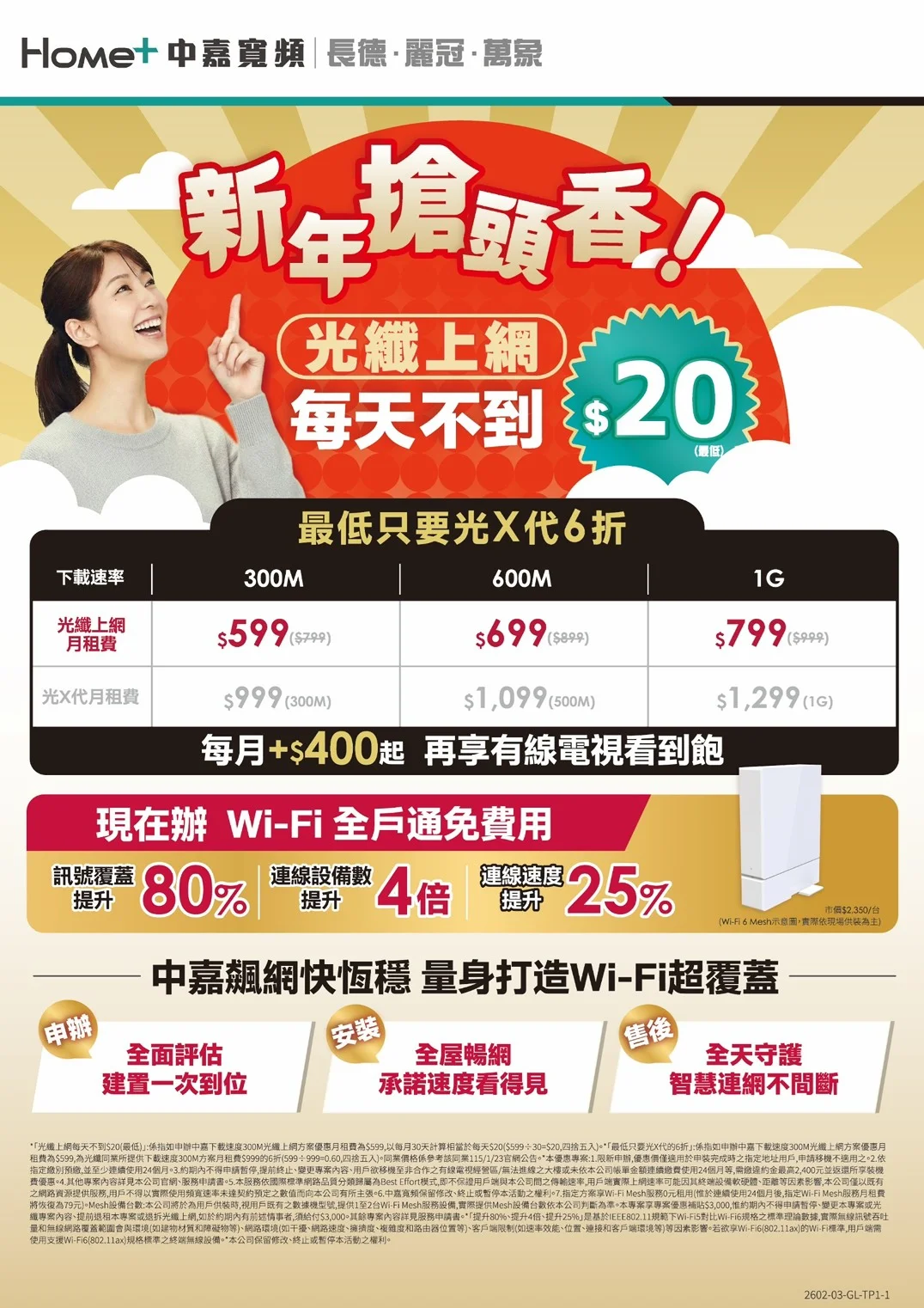 網路老是卡頓、訊號有死角?是時候升級您的家庭網路了!中嘉寬頻|萬象推出「光纖網路」限時方案,月租最低只要 $599起,讓您輕鬆享有極速連線品質,無論是追劇、電競、雲端辦公,都能順暢無阻。
